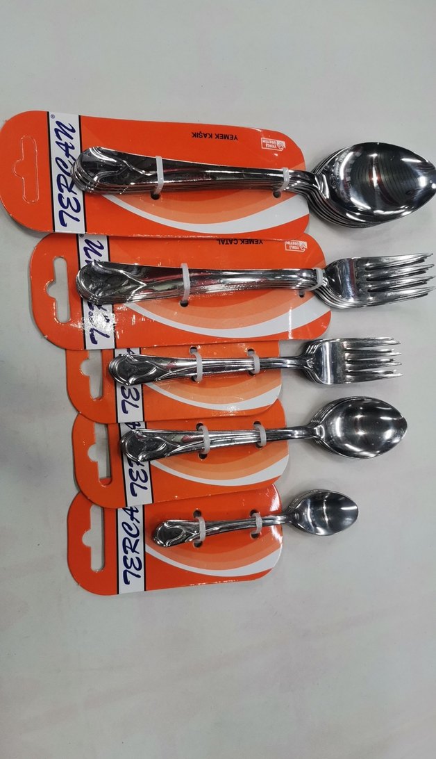 Paslanmaz çelikten yapılmış, çeşitli boyutlarda turuncu saplı çatal ve kaşık seti. Canlı renkli saplarıyla dikkat çeker.