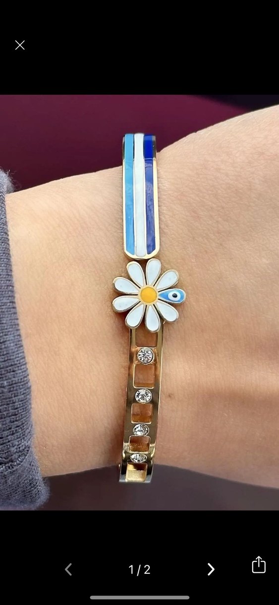 Çiçek motifli, renkli ve tokalı bohem tarzda bileklik. Taşlar ve çizgilerle süslenmiştir.