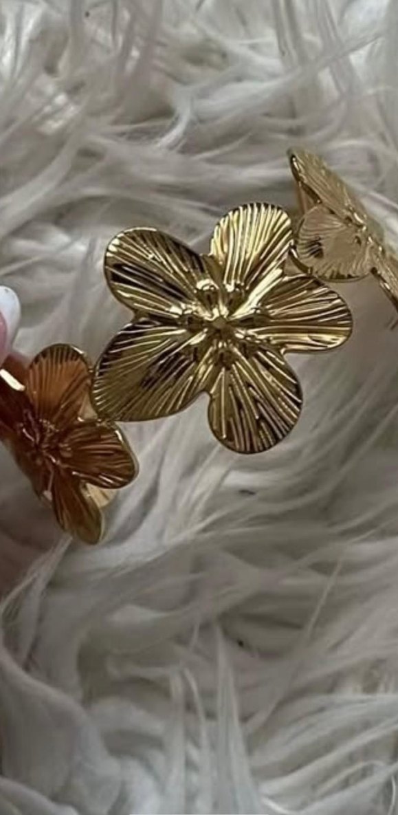 Parlak altın renkte, çiçek desenli ve tokalı tasarıma sahip, minimal bohem tarzda kadın bileklik.