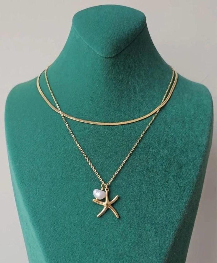 Altın renkli, deniz yıldızı ve küçük inci detaylı, gündelik kullanıma uygun katmanlı kolye.