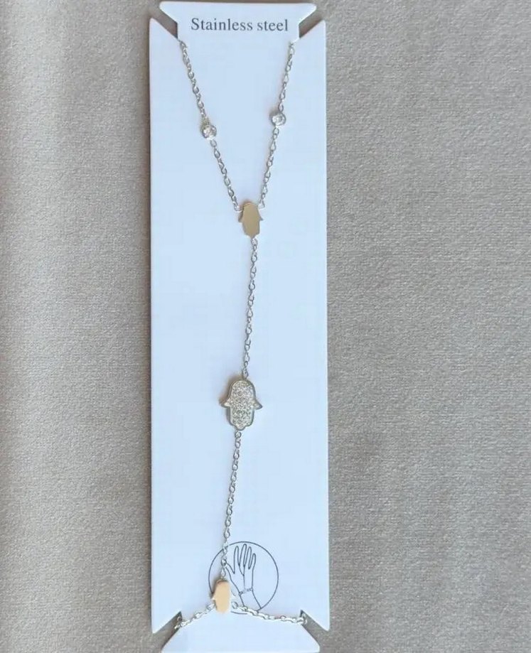 Paslanmaz çelikten yapılmış, zincir detaylı ve baskılı desenli altın renkli kadın el zinciri. Günlük kullanım için uygun, bohem tarzda. ✨