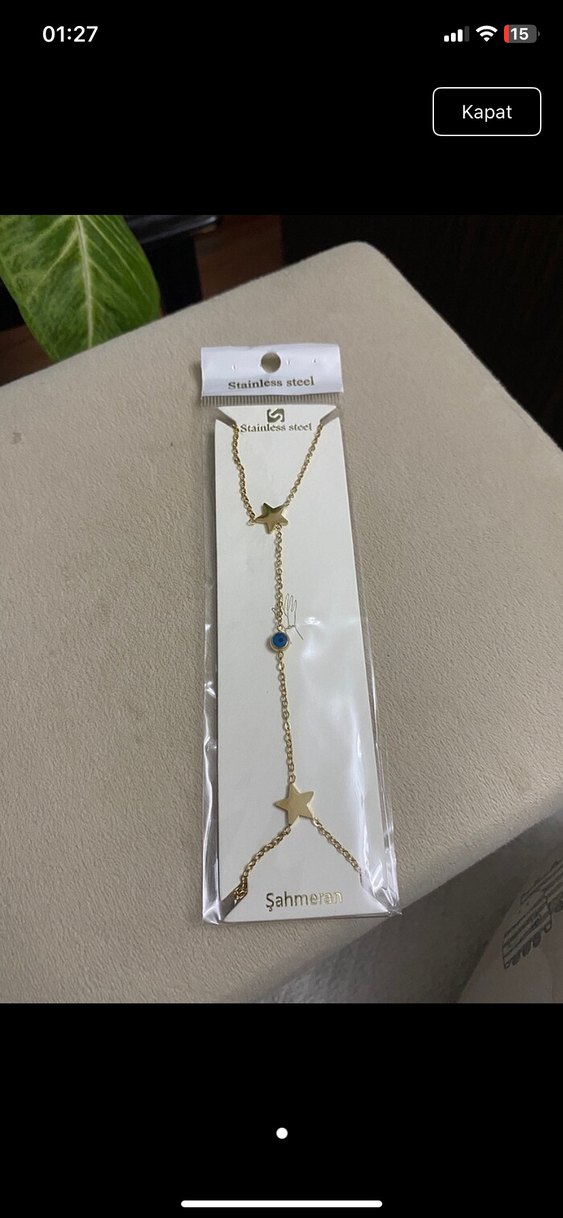 Paslanmaz çelikten yapılmış, yıldız detaylı ve mavi nazar boncuğu süslemeli altın renk kadın el zinciri. Minimalist ve bohem tarz, günlük kullanım için uygundur. ✨ Uygulamadan aldım bir kere kullandım ama benim tarzım olmadığını farkettim o yüzden satıştadır