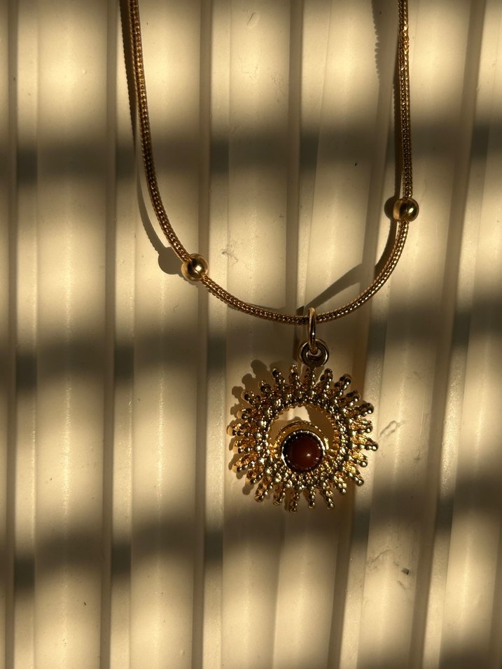 Altın renkli zincir ve ortasında taş bulunan güneş şeklinde kolye ucu ile parıldayan, bohem tarzda günlük kullanım kolyesi. ☀️