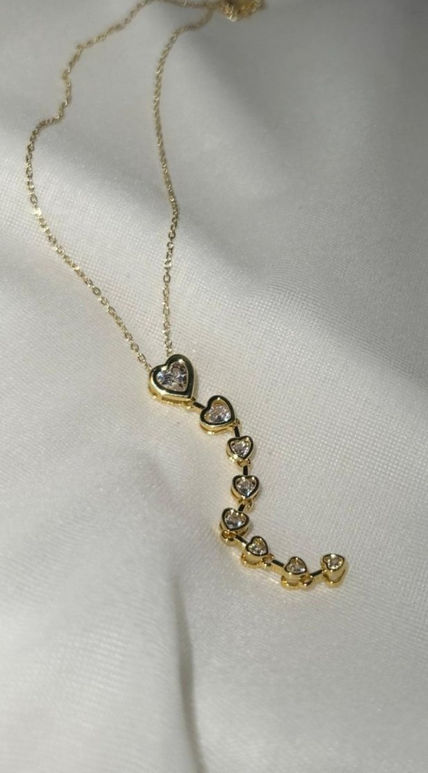 taşlı kalp figürlerinin bulunduğu zarif bir kolye. Modern ve klasik şıklığı, romantik akşamlar için uygundur.