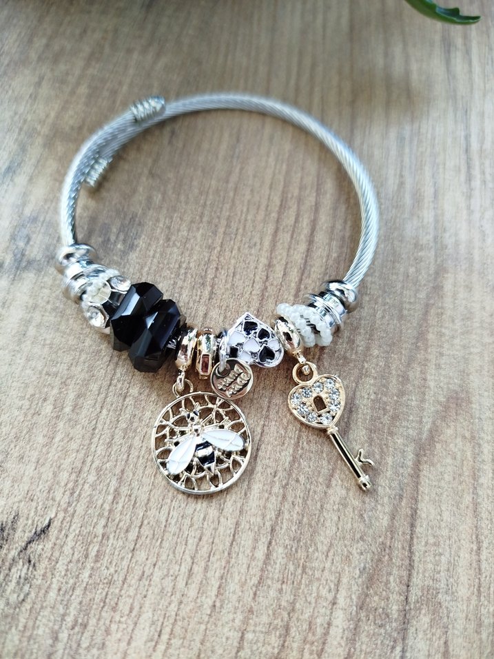 Gri yılan desenli, boncuk detaylı bohem tarzda kadın bileklik. Anahtar ve arı figürlü charmlarla günlük kullanıma uygun, retro ve hippie esintili.