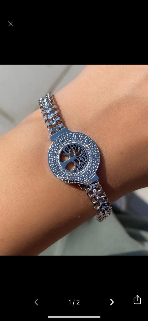 Gri tonlarında, zincir detaylı ve ortasında ağaç motifi bulunan kadın bileklik. Yılan desenli, bohem tarzda, günlük kullanıma uygun.