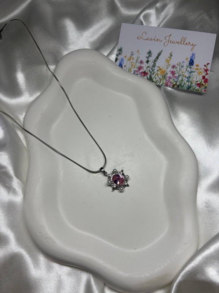 Çelik Gümüş İncili Pembe Taşlı Kolye