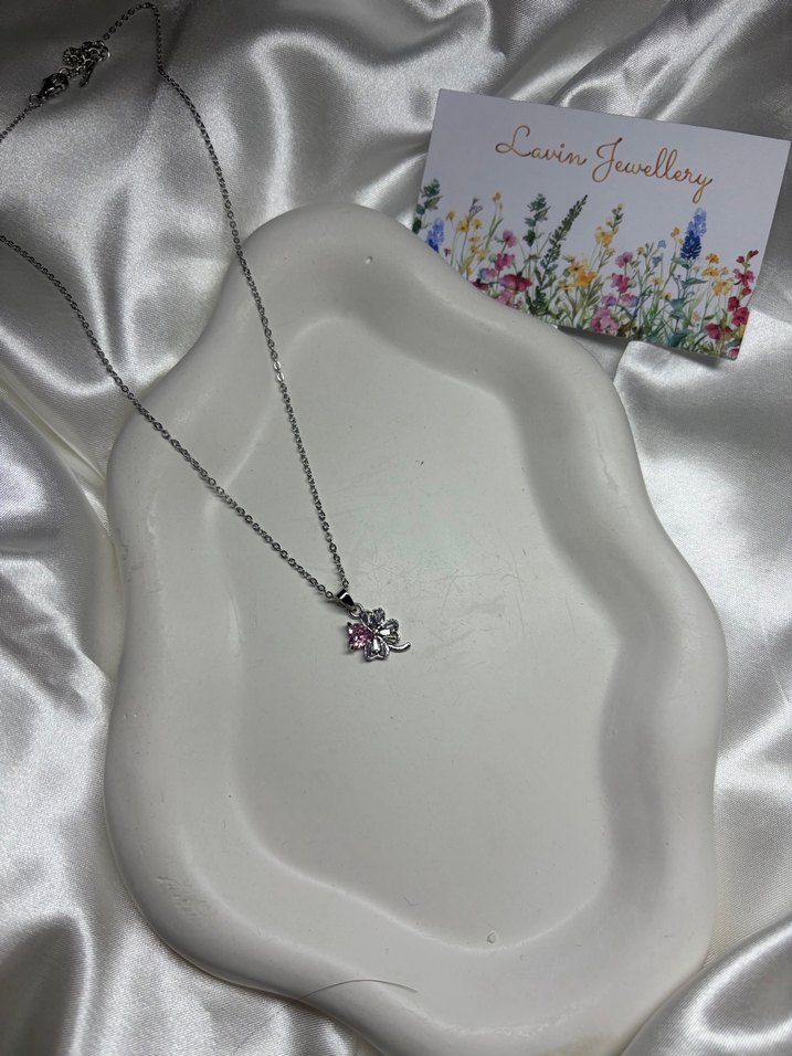 Çelik Gümüş Pembe Taşlı Yonca Kolye