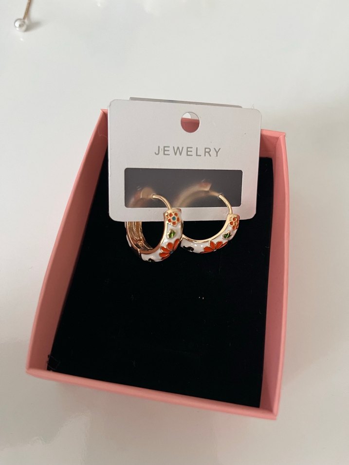 Kısa uzunlukta, renkli baskılı boncuklarla süslenmiş altın halka küpeler. Bohem ve retro tarzıyla günlük kullanıma uygundur.