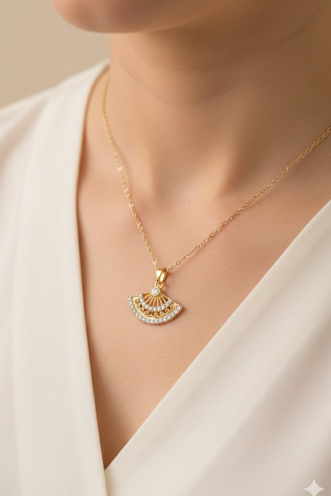 İşlemeli yelpaze şeklinde mini altın kolye, kısa zincir detaylı. Modern klasik tarzda, günlük kullanıma uygun. ✨