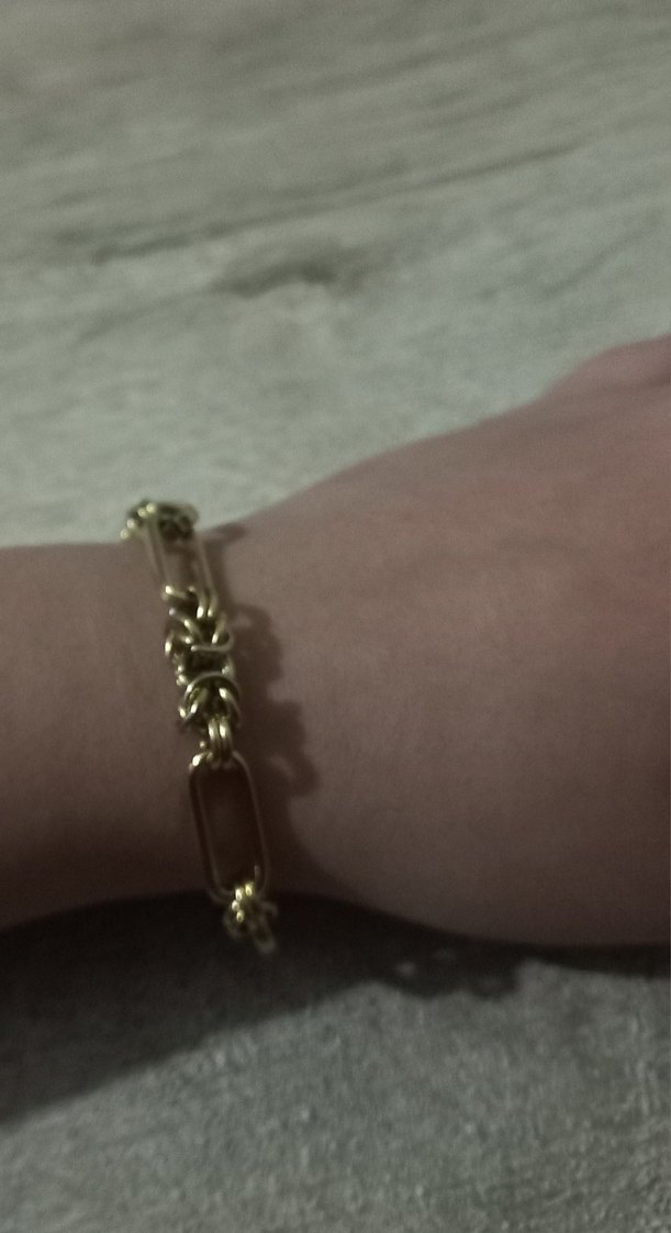 Parlak altın renkte, zincir detaylı ve minimalist tasarıma sahip kadın bileklik, romantik akşamlar için uygun.