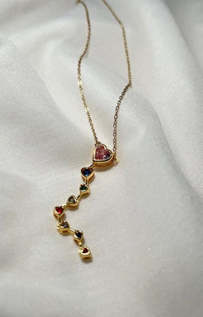 Uzun zincire sahip bu kadın kolyesi,renkli kalp figürleri içerir ve romantik akşamlar için uygundur. Modern ve minimalist tasarımı cesur tarzlara hitap eder.
