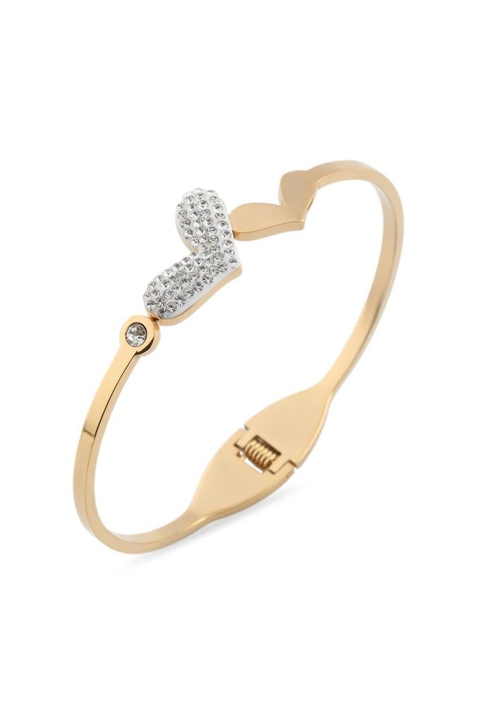 Altın renginde, küçük kristallerle süslenmiş kalp detaylı kemerli bileklik. Minimalist ve zarif tasarım, düğünler için uygun.