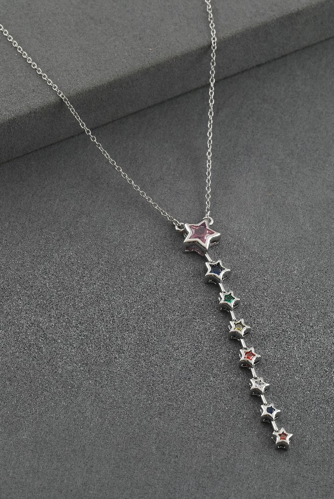 Uzun zincirli, renkli yıldız detaylı kolye. Çağdaş ve bohem tarzı yansıtan tasarım, romantik akşamlar için uygun. ✨Çelik Y kolye