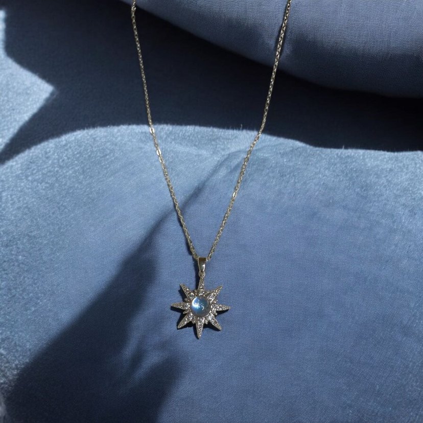 Vintage tarzı, işlemeli mavi kolye ucuna sahip detaylı zincirli midi uzunlukta kadın kolyesi. Günlük kullanıma uygun klasik şıklık sunar.