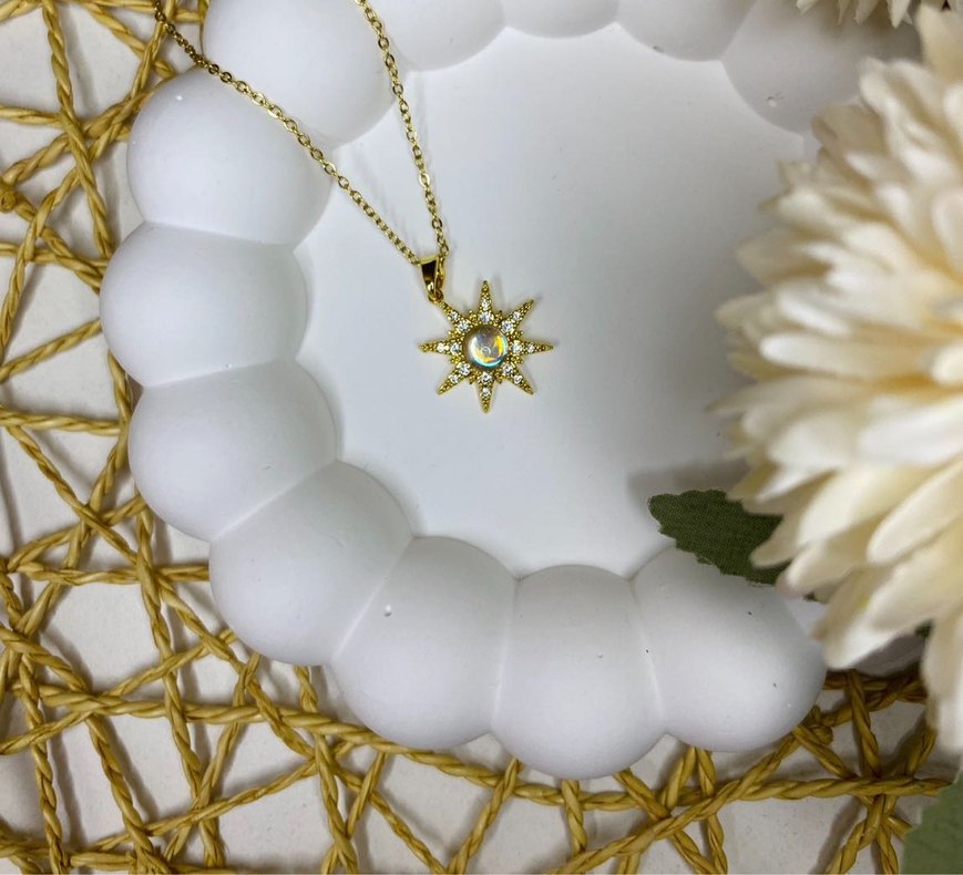 Kısa altın zincir kolye, ortasında taş bulunan detaylı güneş figürüyle minimalist bohem tarzını yansıtır.