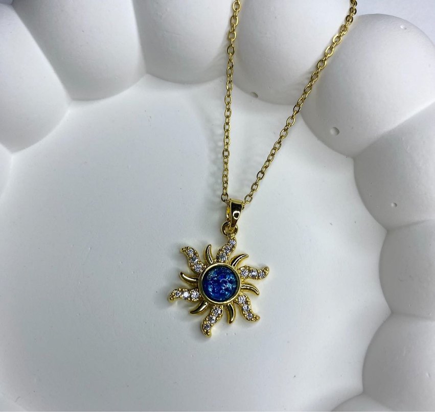 Altın zincirli, renkli taşlı ve ışıltılı güneş figürlü kolye, bohem tarz için uygun.