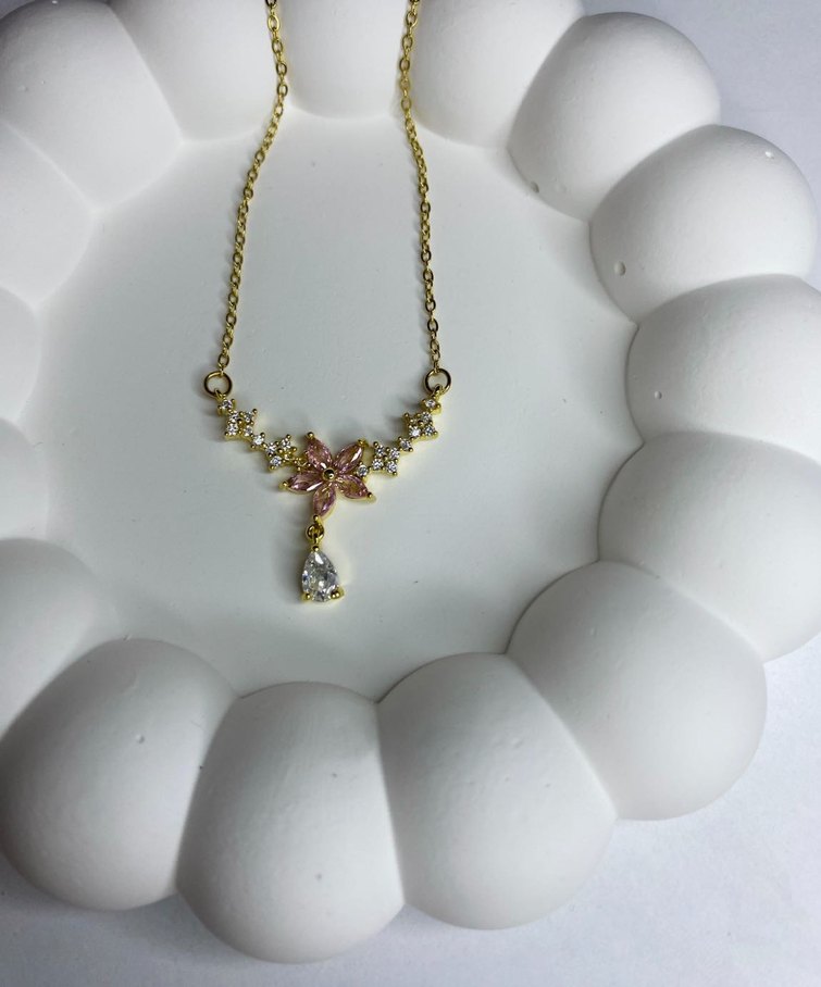 Renkli detaylara sahip çiçek desenli, mini uzunlukta altın renkli zincir kolye, günlük kullanım için uygundur.
