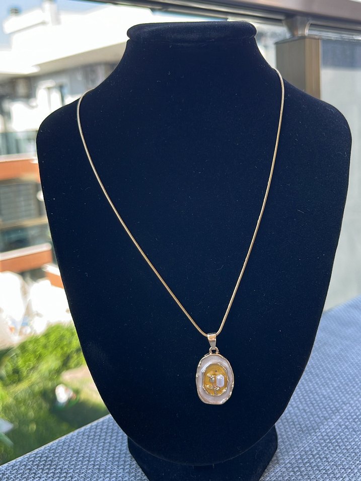 Uzun altın zincirli, pastel tie-dye desenli kolye, bohem Paris tarzını yansıtır, günlük kullanıma uygundur.