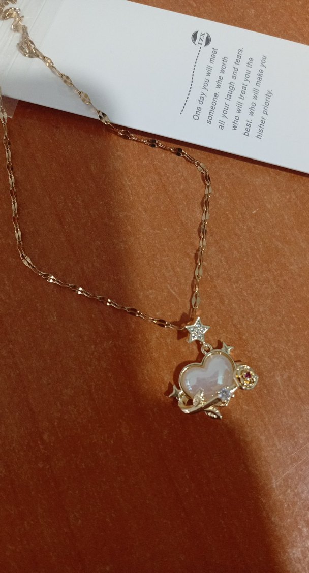 İşlemeli kalp figürlü, yıldız ve kristal detaylı altın renkli zincir kolye, romantik akşamlar için uygundur. Marka: Stainless Steel 316 L çelik tir kararma ve alerji yapmaz sıfır ürün