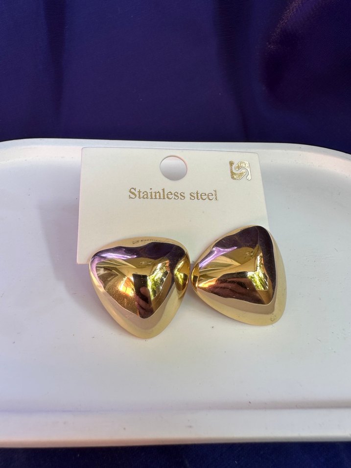 Paslanmaz çelikten yapılmış, kısa, parlak altın renkli metalik küpeler. Minimalist baskılı desene sahip, çağdaş ve cesur tarz için uygun.