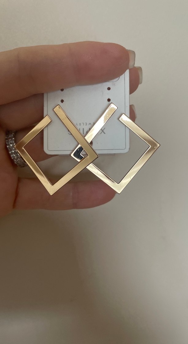 Altın renkli, parlak kare desenli, tokalı midi küpeler. Minimalist ve çağdaş tarzda, günlük kullanıma uygun cesur tasarım.