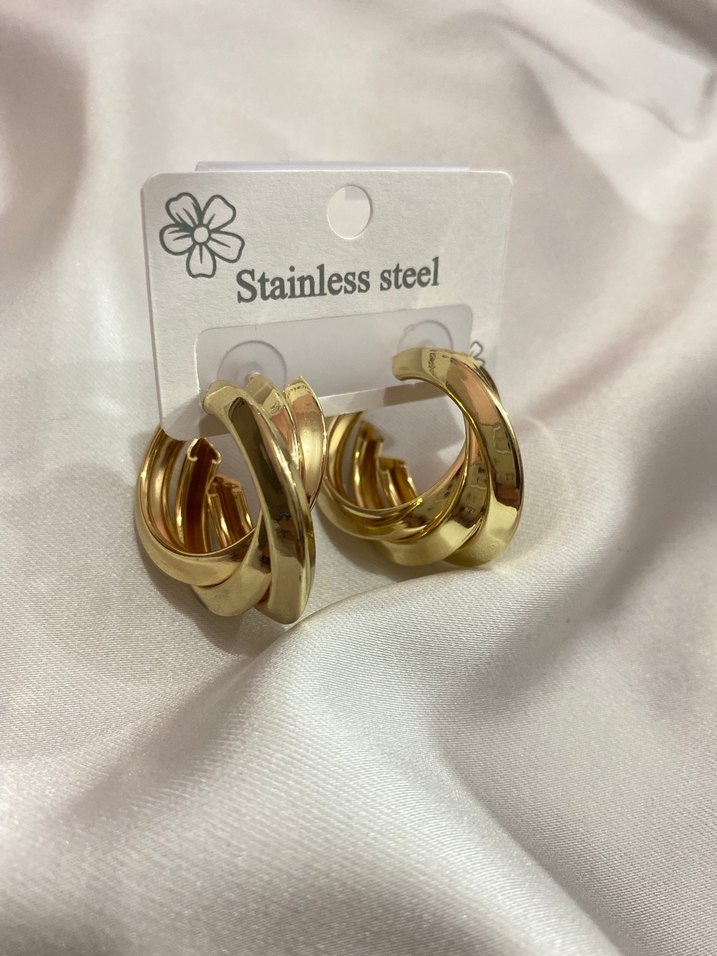 Paslanmaz çelikten yapılmış, tokalı, parlak altın renkli mini halka küpeler. Günlük kullanım için minimalist sokak stiline uygun.