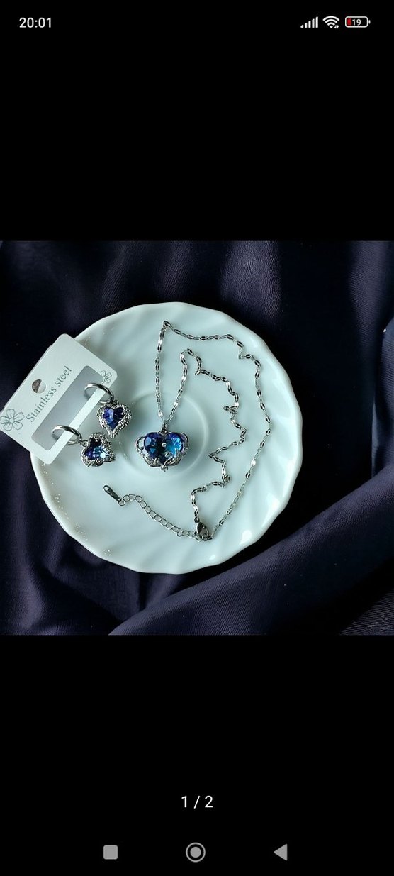 Çelik Mavi Kalp Detaylı Hologramlı Kolye Küpe Set