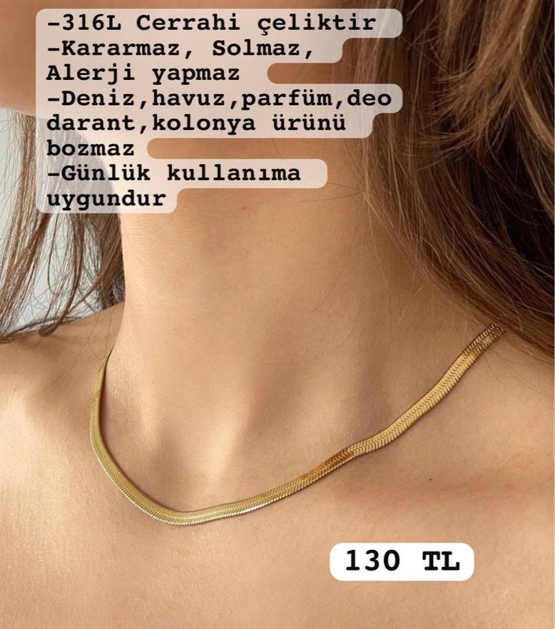 Gold renkli, yılan desenli zincir kolye. 316L cerrahi çelikten yapılıp kararmaz, solmaz ve alerji yapmaz. Deniz, havuz, parfüm, deodorant ve kolonya ile temas eder, günlük kullanıma uygundur.