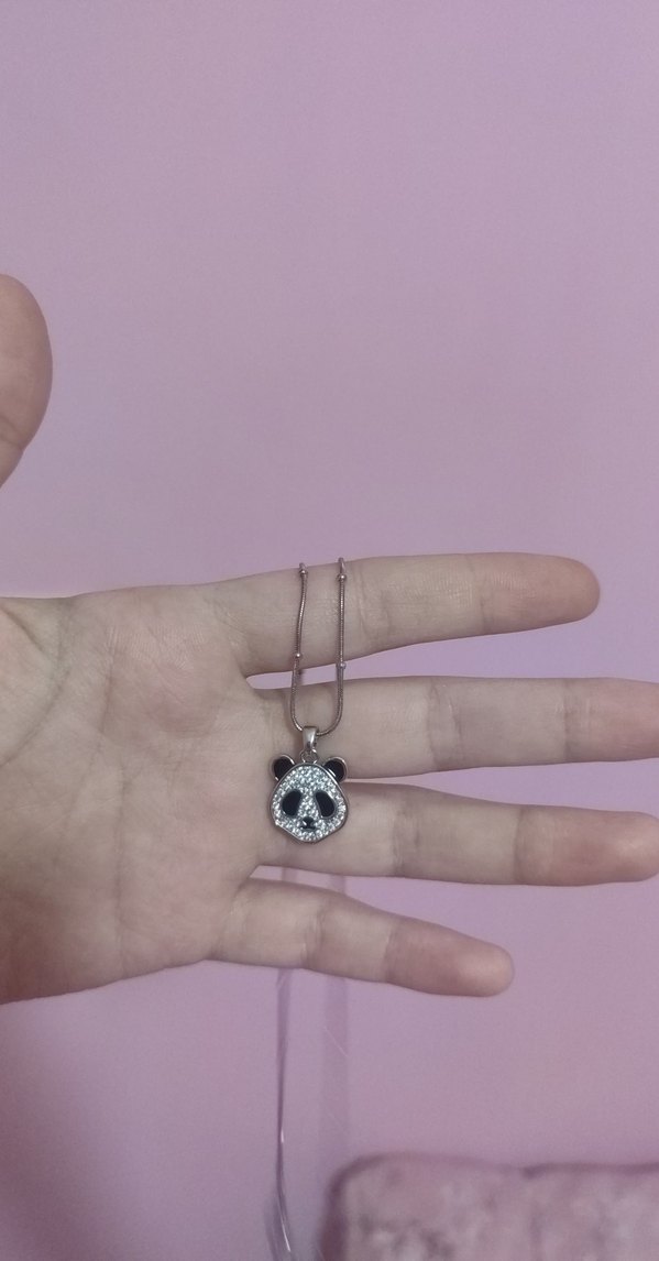 Çelik, payetli panda figürlü, normal uzunlukta kolye. Minimalist ve rock punk havası taşıyan pastel tonlarda.