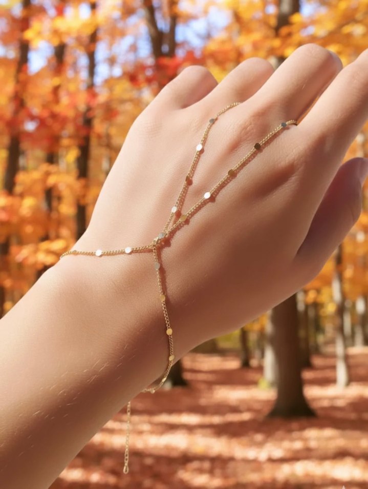 Altın renkli, zincir detaylı ve minimalist yılan desenli kadın el zinciri, günlük kullanıma uygun bohem tarzda.