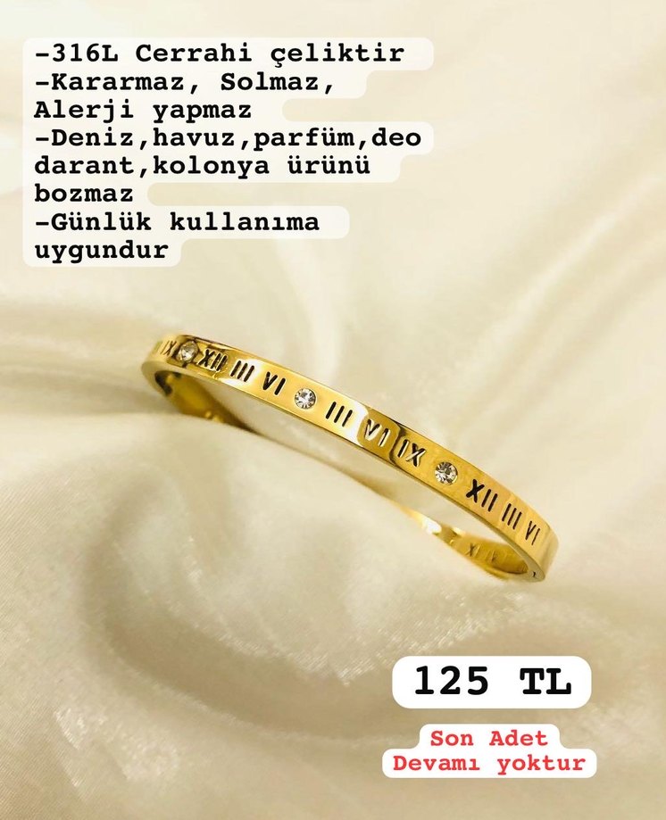 Altın renkli bileklik. Kararma ve solmaya karşı dayanıklı cerrahi çelikten üretilmiştir. Alerji yapmaz, günlük kullanıma uygundur. Romantik gece ve modern klasik tarz için uygundur.