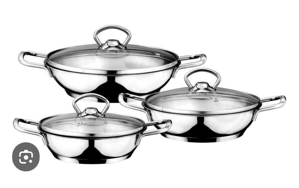 16-18-20 cm çaplarında Akdeniz marka toplam 6 parça cam kapaklı Parlak beyaz çelikten yapılmış, cam kapaklı ve sağlam saplı üçlü tencere seti.