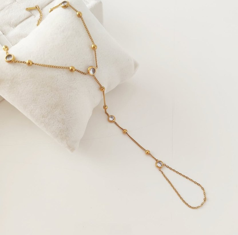Altın renginde, zincir detaylı ve küçük yuvarlak süslemelere sahip minimal ve yılan desenli el zinciri. Günlük kullanıma uygun, klasik ve bohem tarzda. ✨