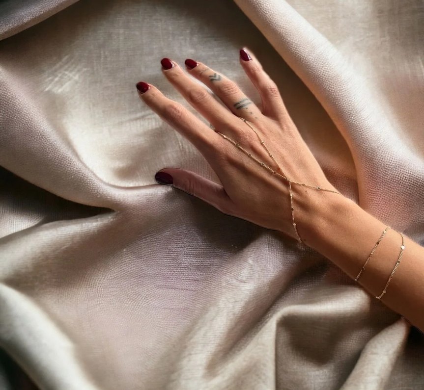 minimalist tarzda kadın el zinciri. Parlak, desensiz tasarımı günlük kullanıma uygun, bohem ve retro esintili. ✨