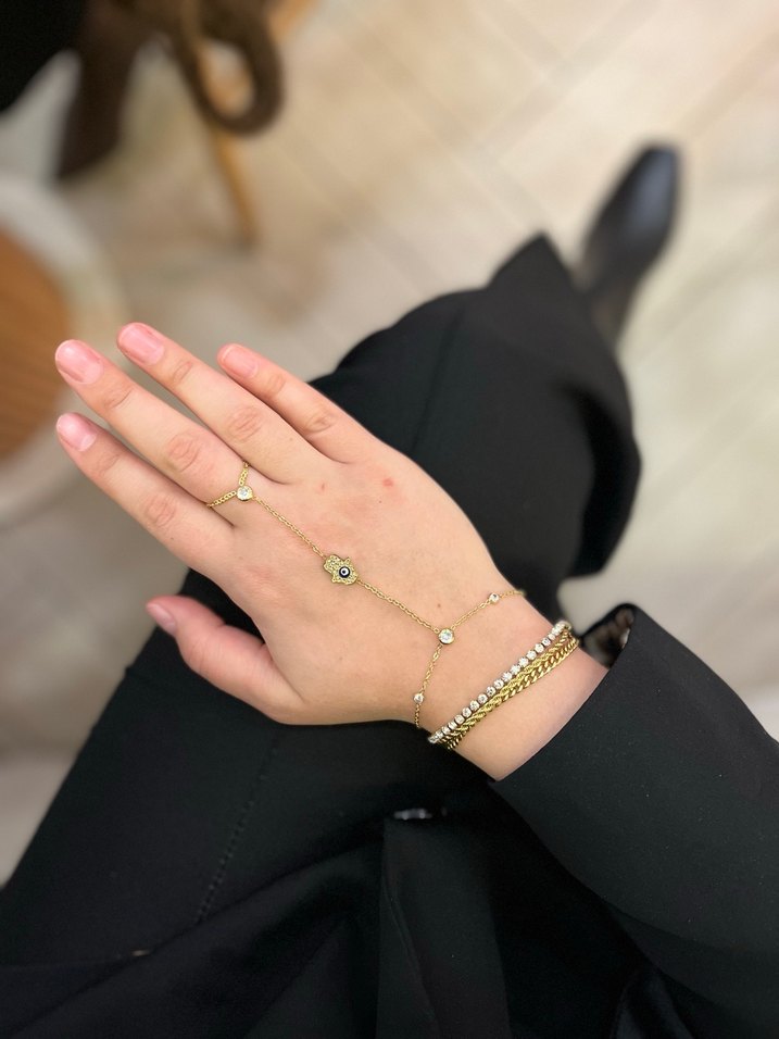 Altın renkli, zarif zincir detayları ve küçük kristal süslemeleri olan el zinciri. Ortasında göz desenli Hamsa el figürü bulunur, günlük kullanıma uygun minimal ve bohem tarzda. ️