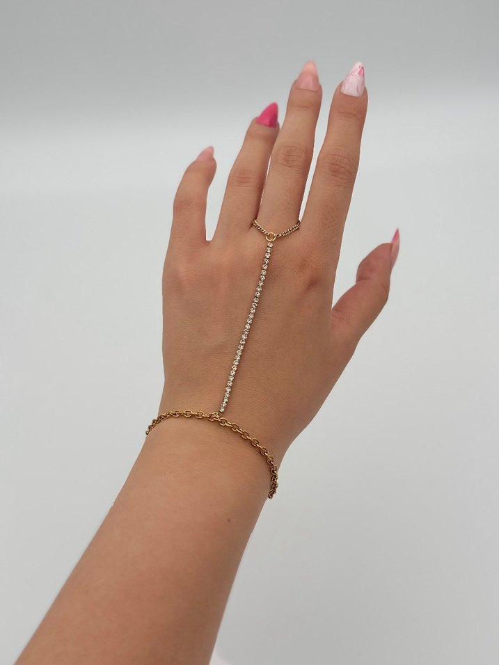 Bilek ve parmak arasında zincir detaylı, minimal tasarımlı altın renk kadın el zinciri. Romantik akşamlar için uygun.