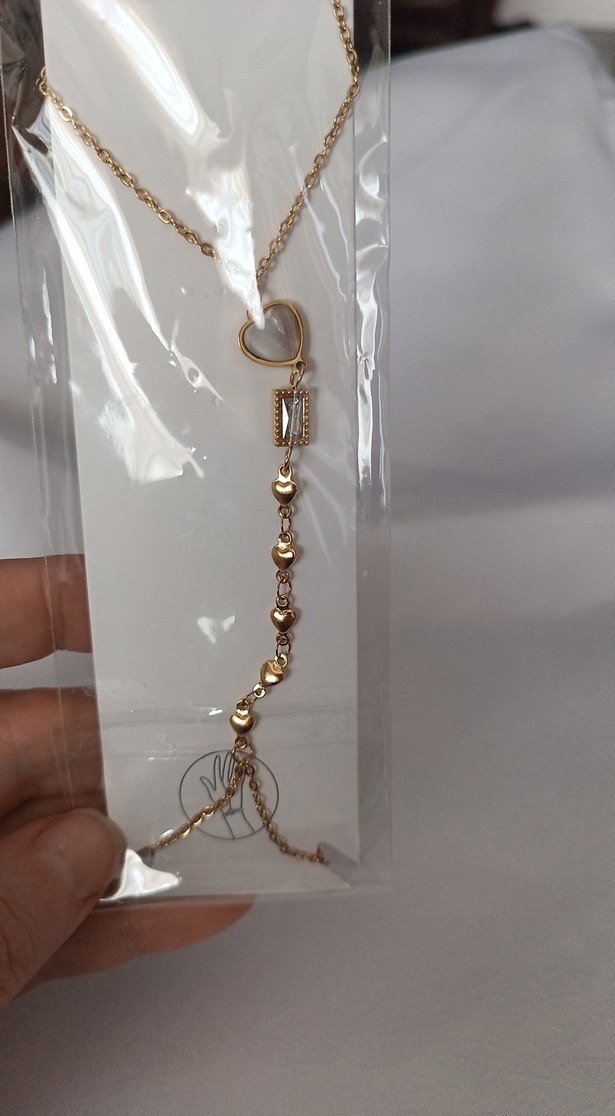 Altın renginde, kalp ve dikdörtgen figürlü zincir detaylı bohem tarzda kadın el zinciri. Günlük kullanıma uygun. çelik Şahmeran