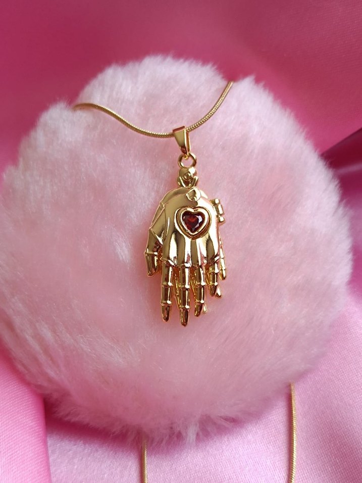 Altın renkli, detaylı zincirli ve kalp şeklinde taşlı gotik el figürlü kolye, romantik akşamlar için uygun.
