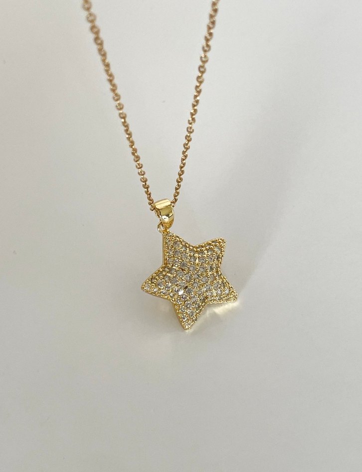 Altın renkli kısa zincirli kolye, pul işlemeli yıldız şeklinde mini bir kolye ucu içerir. Renkli ve işlemeli görünümü modern klasik tarzı tamamlar. ✨