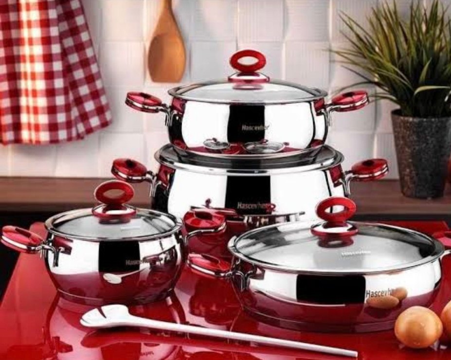 Parlak paslanmaz çelikten yapılmış, kırmızı kulplu ve kapaklı farklı boylarda tencere seti. hascevher marka 8 parça 18/10 paslanmaz çelik kaliteli ağır ürün dür.bu uygulama 10 desiye kadar gönderiyor bu ürün büyük bunu göndermiyor dolap veya sahibinden uygulamasından gondericem almayın benimle iletişime geçin lütfen
