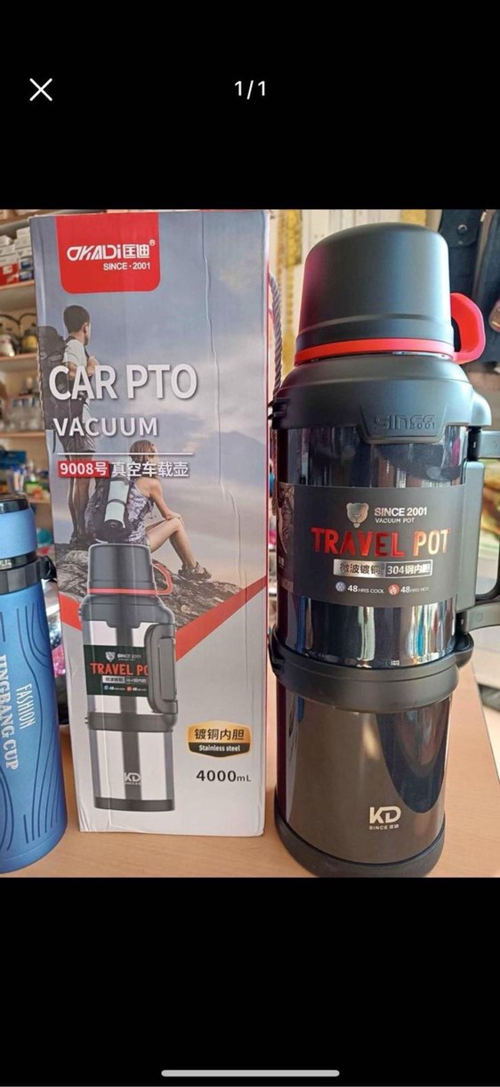Siyah renkli, 4000 ml kapasiteye sahip çocuk termos şişesi. Vakum izolasyonlu, paslanmaz çelik iç yüzey ve taşıma kulpu bulunur.