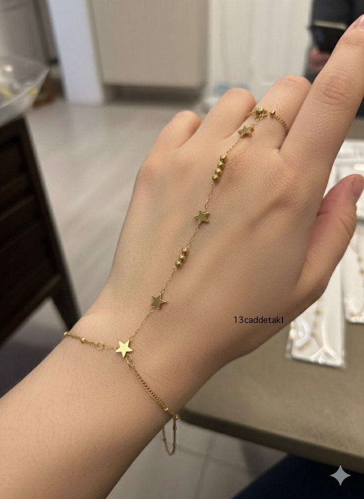 Altın renkli, yıldız ve boncuk detaylı kadın el zinciri. Minimalist ve bohem tarzda, günlük şıklık için uygundur. ✨