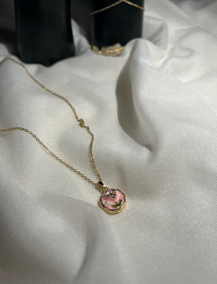 pastel pembe çiçekli kolye ucu ve ince zincir detayına sahip, bohem tarzda klasik zarafet sunan kadın kolyesi.
