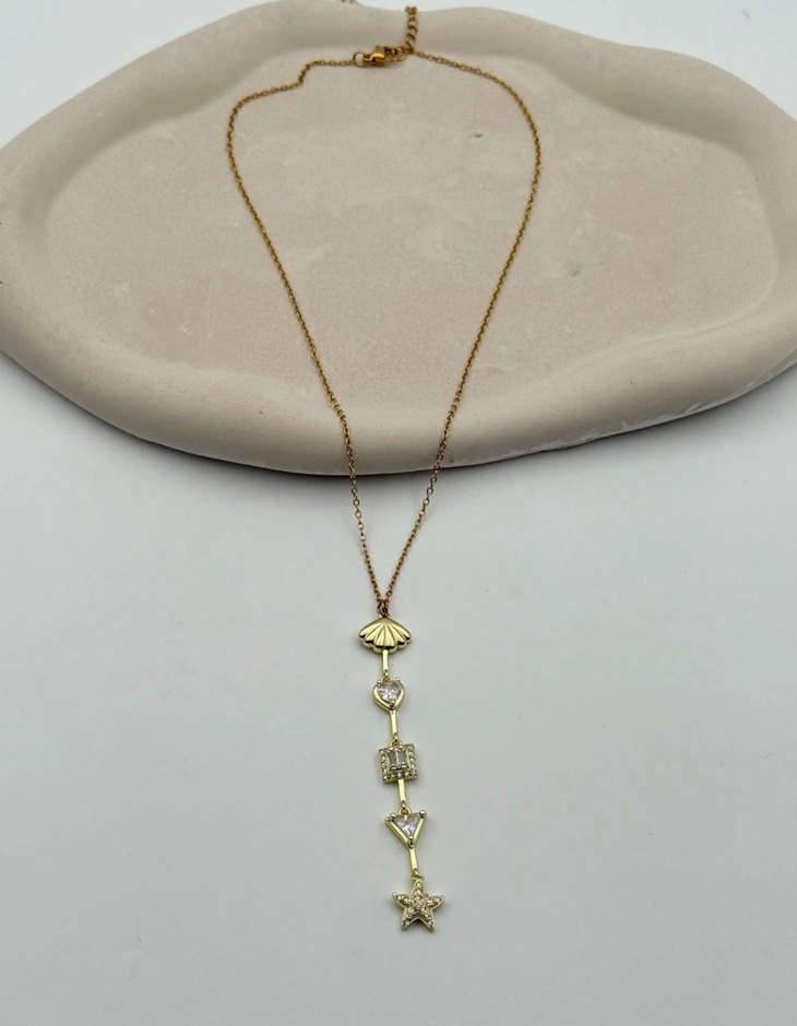 Altın renkli uzun zincir üzerinde deniz kabuğu, kalp, kilit, ok ve yıldız figürleri bulunan bohem tarzda kolye. ✨ Stok durumunu sorunuz