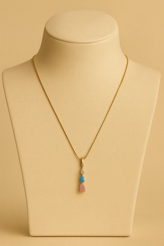 Kadın kolye, pastel turkuaz ve pembe taşlarla detaylandırılmış ince zincire sahip. Minimalist ve çağdaş tasarımı bohem ve retro stillerle uyumlu, romantik akşamlar için ideal. Çeliktir kararma yapmaz