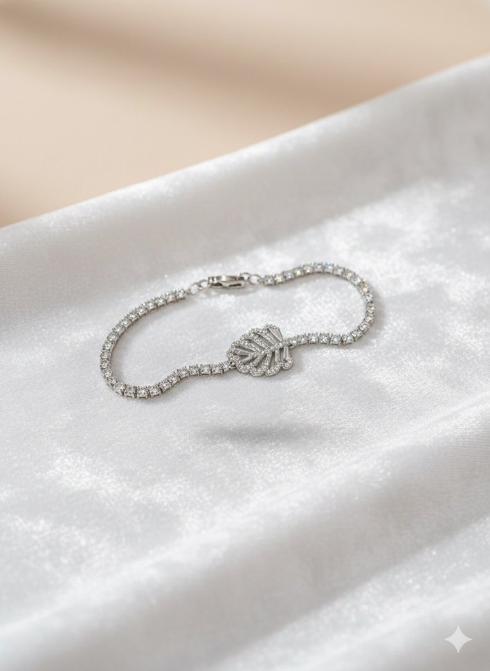 Kadın bilekliği, yaprak deseni ve taşlı detaylarla modern klasik görünüm sunar, günlük kullanım için uygundur. ✨