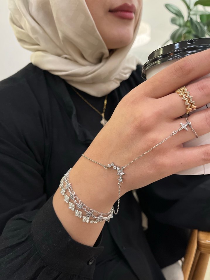 Gümüş renkli zincir detaylı, bohem ve minimalist tarzda kadın el zinciri. Düğün ve retro görünüm için uygundur.