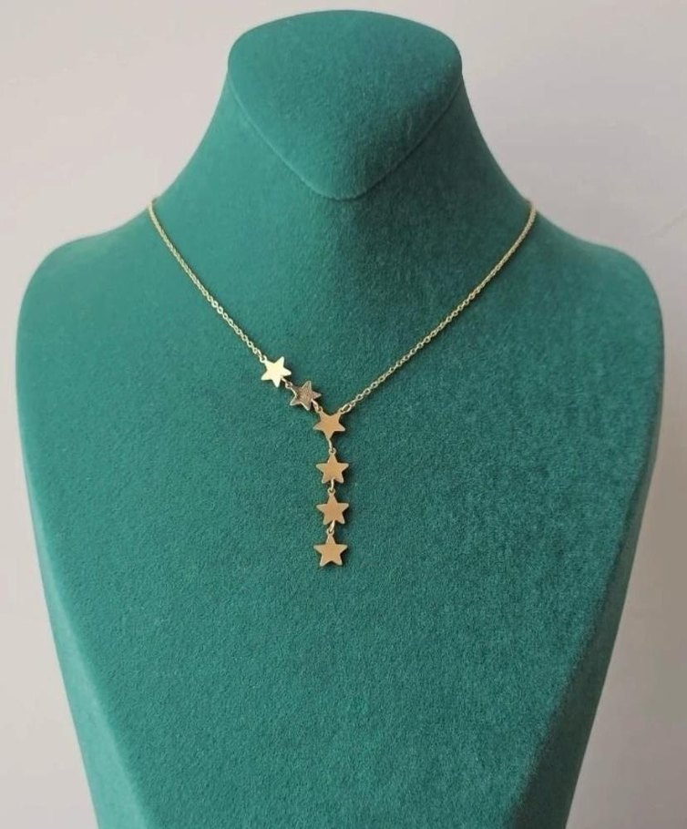 Minimalist tarzda altın renkli zincir detaylı, işlemeli yıldız desenli, parlak ve midi uzunlukta kolye. Günlük kullanıma uygun.