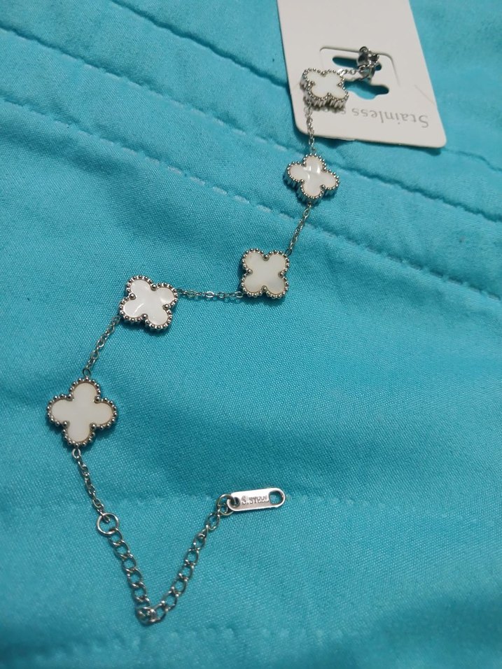Turkuaz renkte, zincir detaylı ve nakışlı yonca figürlü kadın bilekliği. Minimalist ve bohem tarzı yansıtır, açık hava etkinlikleri için uygun.